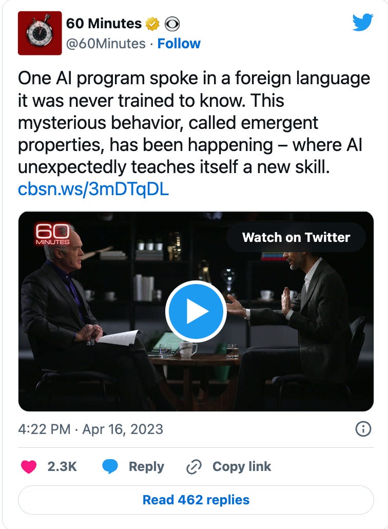 The narrator in the clip explains that Googleâs large language model learned how to translate all of Bengali without being trained on any Bengali text. This is the idea of emergent behavior â that at a certain scale, models can do things that arenât expected of them; that given enough data, we can no longer predict what theyâre capable of. Emergence has become the core animating idea of sentience and artificial general intelligence â if a model can teach itself to learn a new language, the question becomes, what else might it learn to do?