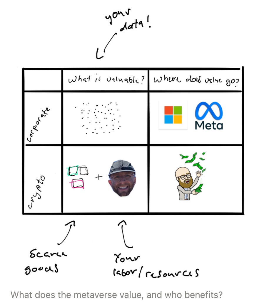 The third group of influencers includes crypto enthusiasts — venture capitalists, libertarians, and techno-solutionists — all trying to bring a "decentralized" metaverse into existence. If you don't know why I'm putting "decentralized" in quotation marks, stop reading this piece and read my other piece about how decentralization in crypto is more of a veil and less of a reality. They also want to monetize more of the digital world — but it's not your data that they're after, it's artificially scarce digital goods.