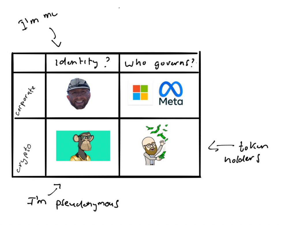 🥸 One conundrum the crypto community will confront has to do with identity. The crypto community privileges pseudonymity. On crypto Twitter, for example, first and last names are often replaced with .eth or .sol. People's pictures are replaced with cartoon jpegs. Pseudonymity helps people who might need to protect their identity (e.g. an oft-persecuted human rights advocate) while also enabling unaccountable harassment.
