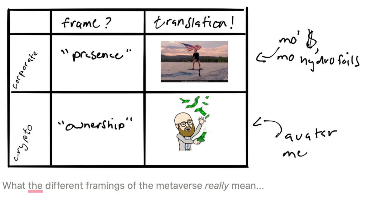 If "presence" and "immersive" represent the corporate frame, then "ownership" and "economic empowerment" represent the crypto alternative. Crypto enthusiasts emphasize that smart contracts, by removing the middleman, enable new economic models like "play-to-earn" gaming, where gamers earn significant sums by playing games. As you earn tokens, you can do things like buy new avatars or digital real estate.